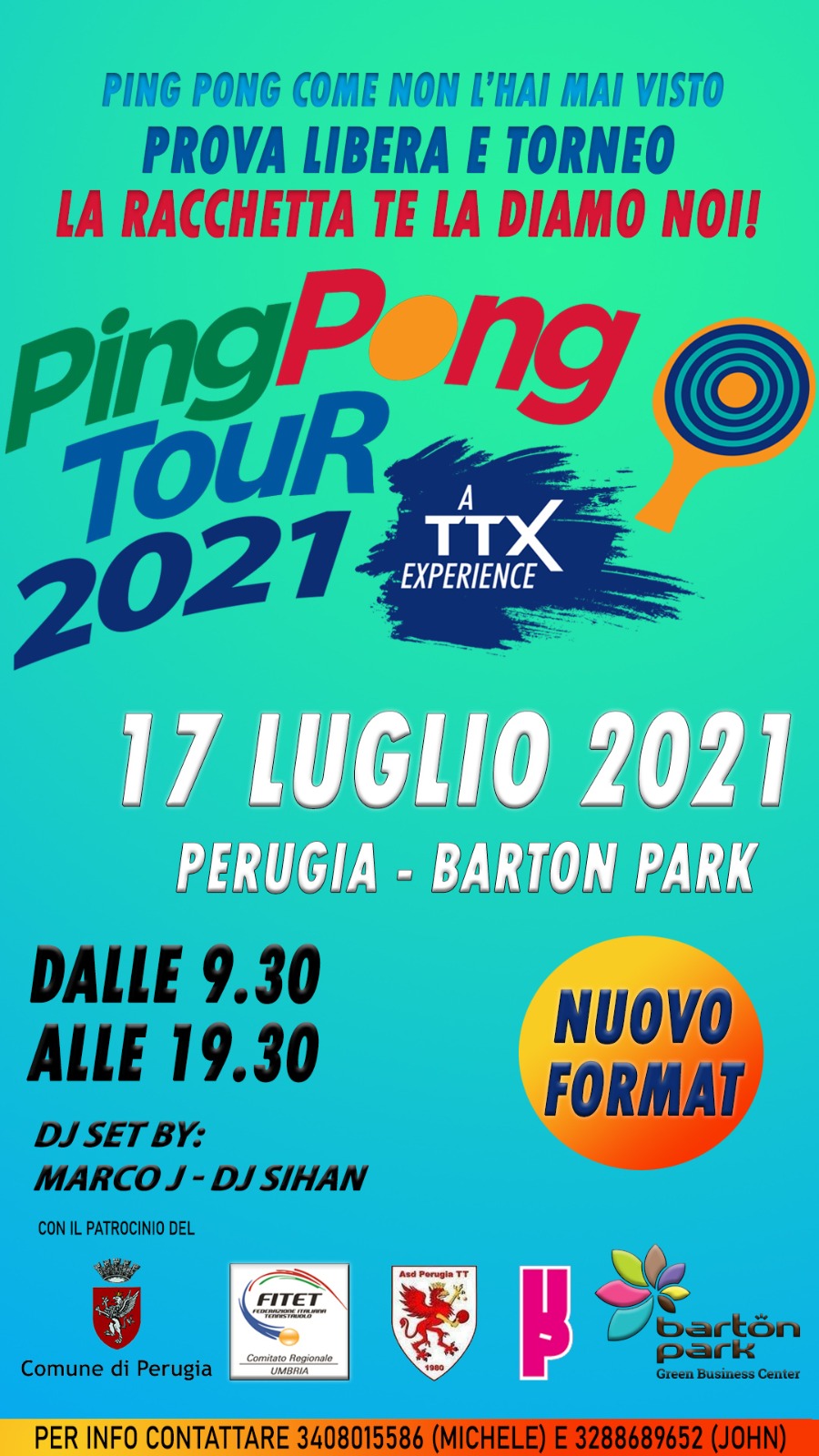 Il ping pong come non l’hai mai visto. È questo lo slogan della manifestazione “Ping Pong Tour. A TTX experience”, promossa dalla Federazione Italiana Tennistavolo per questa estate. Tra le venti tappe previste, ci sarà quella di Perugia organizzata dal Comitato Regionale Umbria e dall’ A.s.d. Perugia Tennis Tavolo, con il patrocinio del Comune di Perugia. L’evento, in programma sabato 17 luglio nella splendida cornice di Barton Park, nasce con lo scopo di promuovere su tutto il territorio nazionale la disciplina sportiva del tennis tavolo, andando a coinvolgere il maggior numero di partecipanti, con un unico obiettivo: il divertimento. Il TTX è nato nel 2019 quando, per la prima volta, vennero installati circa 30 tavoli ai Fori Imperiali di Roma, con appassionati che giunsero nella Capitale da ogni parte d’Italia e non solo. Oltre alla nazionale italiana tennis tavolo, aderirono all’iniziativa anche molti campioni di altre discipline sportive ed esponenti del mondo politico, tra cui il sindaco di Roma Virginia Raggi.