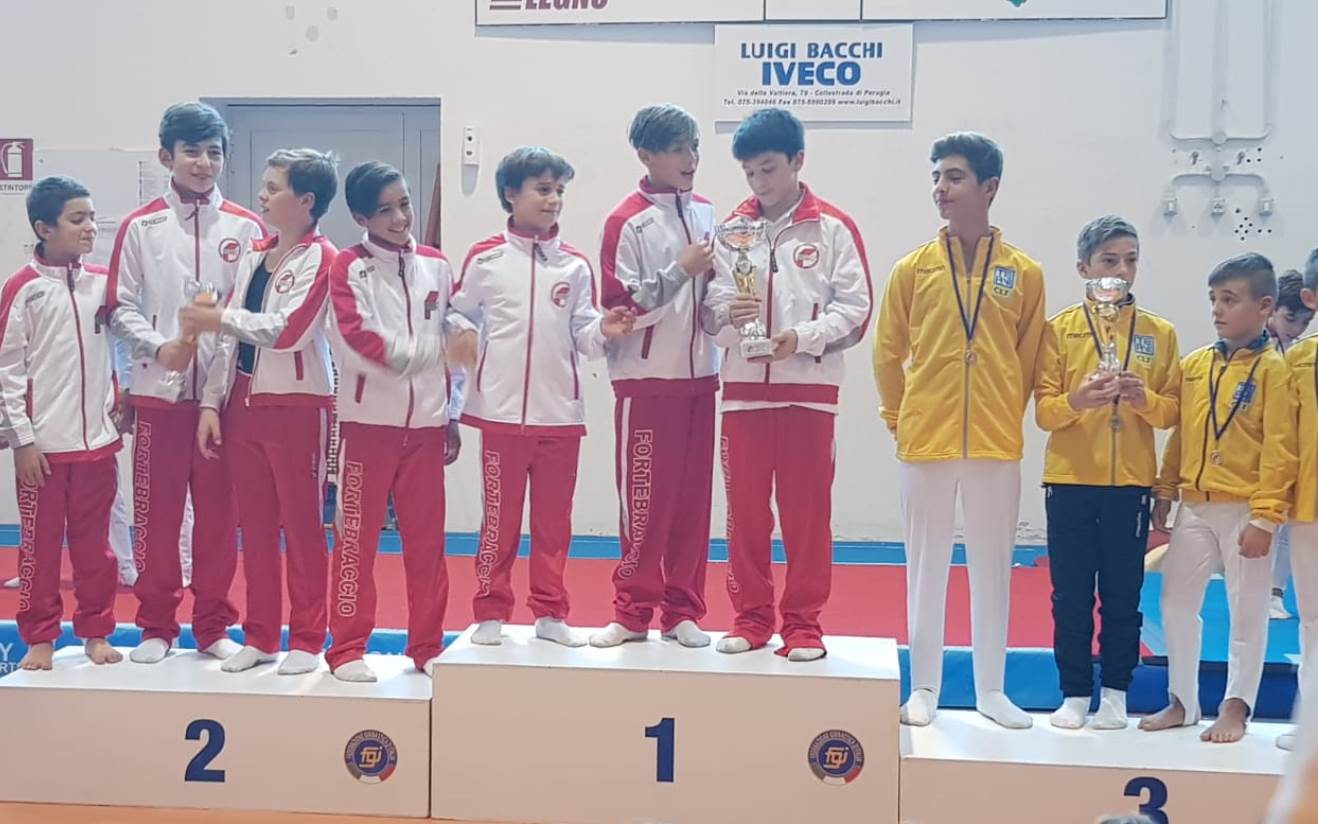 Quella degli Allievi Gold 3, invece, è una gara particolare riservata a ginnasti di 8 e 9 anni e prevede il programma tecnico A1 sui 6 attrezzi (anelli, cavallo con maniglie, corpo libero, parallele, sbarra e volteggio). In questo caso due sono state le squadre partecipanti, una della società CLT Terni composta da Filippo Bilancini, Marco Del Furia, Mattia Laudi e Pietro Vagliani salita sul 1° gradino del podio e una della Fortebraccio (Giona Guaitini e Louis Elian Massarelli) sul 2°.