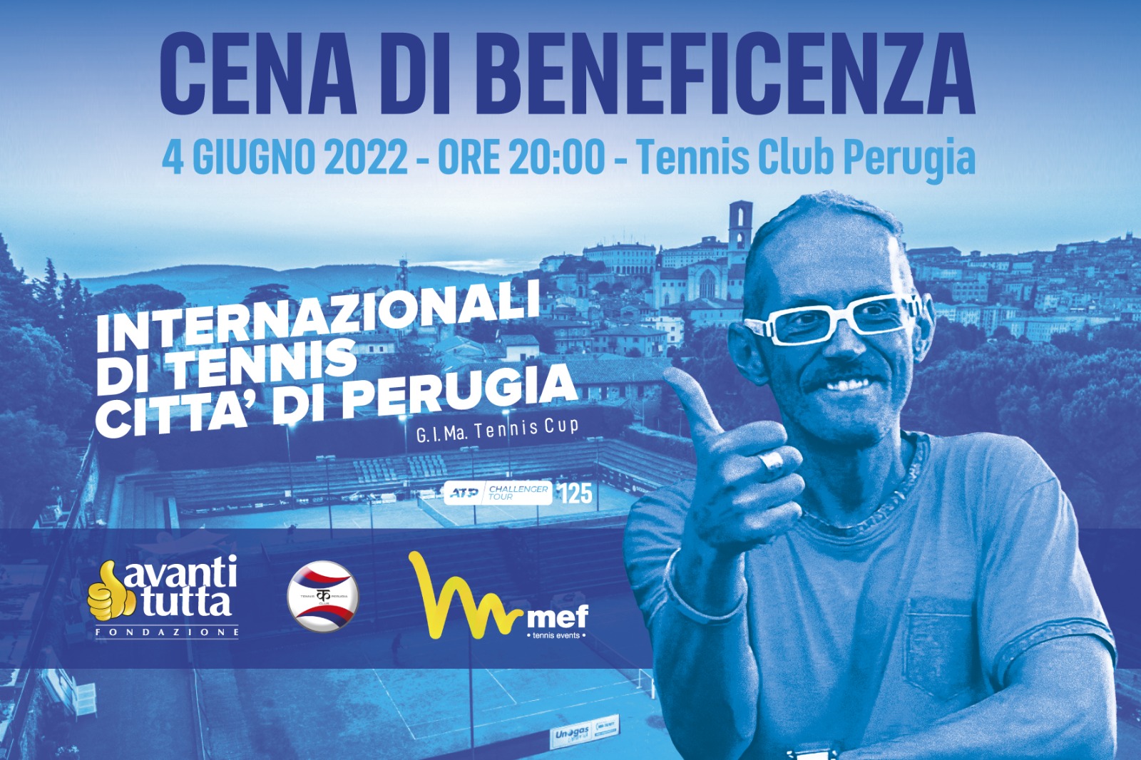 Nell’attesa di apprezzare il grande tennis internazionale, il Tennis Club Perugia è pronto ad ospitare un importante evento solidale. Sabato 4 giugno presso la splendida struttura di Via Bonfigli a Perugia (ore 20), alla vigilia del via ufficiale degli Internazionali, si terrà una cena di beneficienza organizzata dalla Fondazione Avanti Tutta per raccogliere fondi da destinare alla riqualificazione della sala d’attesa del Day Hospital di Oncologia Medica dell’ospedale di Perugia. Un’opera finanziata completamente da Avanti Tutta, che ha l’obiettivo di migliorare l’accoglienza, l’utilizzo e la vivibilità degli spazi con un aumento di circa il 25% dei posti a sedere. L’evento, oltre che fare da cornice al prestigioso torneo tennistico, aprirà ufficialmente la serie di iniziative di cui si farà promotrice la Fondazione Avanti Tutta nel corso degli stessi Internazionali. Una binomio azzeccato e funzionale quello con la Mef Tennis Events, dove solidarietà e sociale si intersecano alla perfezione con il grande sport.