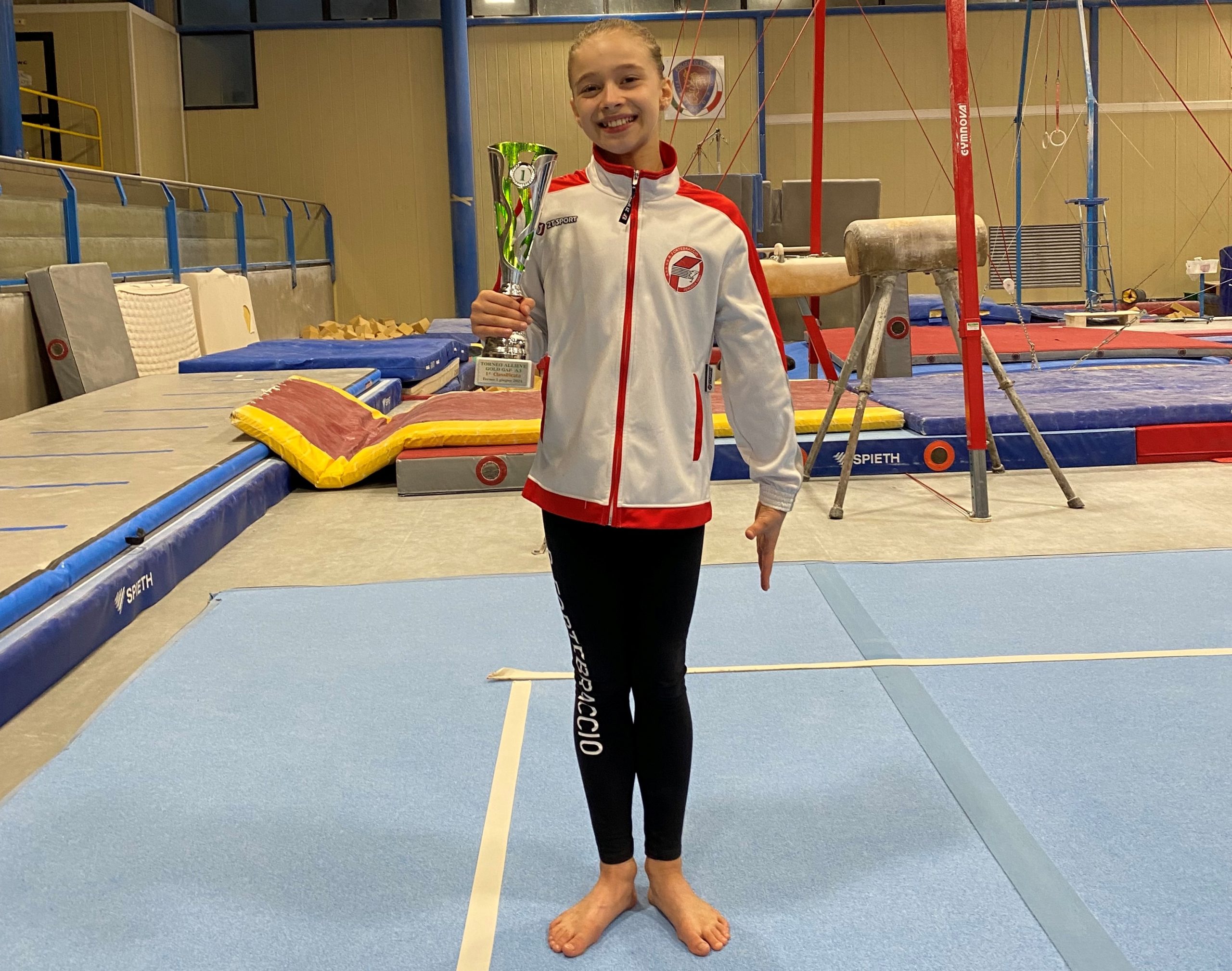 Dopo aver gareggiato al Campionato Nazionale Gold Allieve di Riccione, Caterina ha preso parte a questa importante gara nella fascia Gold A3 che prevedeva la salita sui 4 attrezzi canonici (volteggio, parallele asimmetriche, trave, corpo libero), più l’attrezzo cinghietto (propedeutico alle parallele) riservato alle allieve Gold.