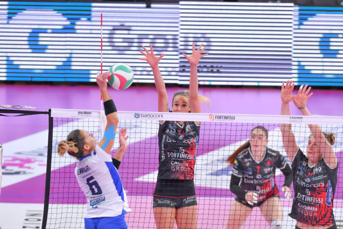 Le “magliette nere” non sono tranquille e l’avvio del terzo set è tutto di Bergamo che scatta sul 3-0 con due muri, poi Carcaces dà il primo punto alle umbre. L’errore di Angeloni consegna il 2-6 alla Zanetti e obbliga Mazzanti a fermare il gioco. Le lombarde sono in fiducia e Carcaces deve fare gli straordinari con tre punti di fila che valgono il 6-8. Bergamo commette invasione a rete e sul 7-8 Turino si gioca il time out, allarmato dal calo di concentrazione della propria squadra. Al rientro in campo Lanier trova il mani e out per il 7-9. Perugia si riporta in linea di galleggiamento e con Koolhaas e un errore di Loda acciuffa la parità a quota 11. La Zanetti mette di nuovo la testa avanti guidata da Lanier e Mazzanti chiama time out e manda in campo Havelkova al posto di Ortolani. La Bartoccini Fortinfissi prova ad avvicinarsi con Aelbrecht, ma Enright e il muro di Bergamo valgono il 14-19. Un errore di battuta di Havelkova e un attacco fuori di Carcaces consegnano il 15-21 alle ospiti, che chiudono 18-25 con tre punti dell’ex Mio Bertolo.