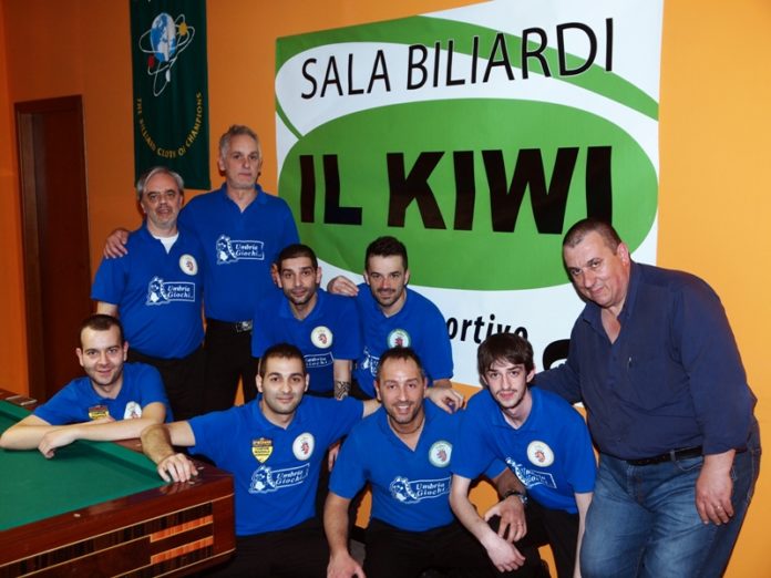 Al Circolo Sportivo il KIWI di via Pievaiola a Perugia hanno festeggiato con le “bollicine” la vittoria nel campionato regionale sezione boccette della serie A/1, la massima divisione in cui hanno conteso 19 squadre. E oltre ai giocatori di capitan “orso”, che sembrava aver trovato una riserva di miele da gustare, c’erano anche i giocatori delle altre due squadre KIWI, c’erano tanti amici e tanti sportivi che hanno seguito dalle tribune e dal mega schermo le partite dell’ultima giornata. E’ terminato 6 a 0 l’incontro con il Biliardo Più 2, sconfitto anche all’andata con lo stesso punteggio. Alessandro Forlimbergi, Mirco Bernasconi, Leonardo Mariani, Roberto Forlimbergi, Umberto Apicella, Giulio Ribigini, Giacomo Pulci e Fabrizio Ermasi: “capitan orso” sono stati letteralmente portati in trionfo tra i biliardi del KIWI cantando la nota canzone della vittoria. Partiti in sordina, partita dopo partita, i giocatori del team Umbria Giochi, sollecitati sempre da patron Silvio sono riusciti, nel rush finale, ad accumulare punti preziosi che, alla fine, li hanno portati a conquistare il titolo regionale. “E’ una grande soddisfazione – ha detto il capitano – soprattutto perché siamo tutti del “vivaio” del KIWI, non ci sono giocatori da fuori, delle Marche e della Romagna, e quindi la nostra vittoria è prettamente umbra, perugina e questo ci inorgoglisce”. “Il biliardo umbro, la sezione boccette di cui sono presidente regionale – ha detto Rossano Mazzetti – è cresciuto molto anche grazie alla struttura del KIWI che, come hanno riconosciuto grandi giocatori, pluricampioni italiani, è veramente un vero “tempio del biliardo”. La crescita degli iscritti di livello agonistico in Umbria è un dato che mi riempie di soddisfazione, segno che tutti abbiamo lavorato bene. E la conquista dell’ingresso tra i 16 master d’Italia del folignate Proietti è un esempio lampante che apre anche ad altri giocatori umbri l’ingresso in questa prestigiosa categoria.”