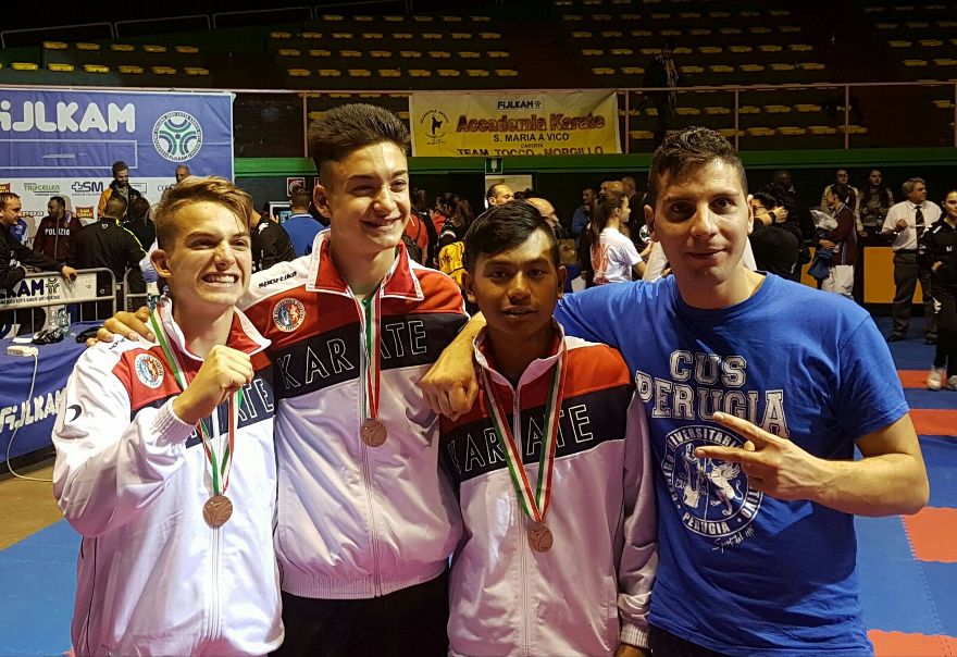 Risultato di gran rilievo quello ottenuto dalla squadra giovanile del Cus Perugia che, con il bronzo conquistato ai ’27° Campionati Italiani a Squadre Giovanili’ si conferma come una delle migliori scuole nazionali anche nel campo dei Kata. La manifestazione vedeva di fronte i venti migliori team nazionali qualificatisi dopo le dure selezioni regionali e pronti a sfidarsi per conquistare l’ambito tricolore. I ragazzi allenati da Giovanni Maurizi si sono presentati all’appuntamento con la consapevolezza di avere le carte in regola per poter puntare in alto tanto che. Il club perugino schierava i giovani Alessandro Cricco, Mirco Barreca e Alison Bauyon che sono saliti sulle tappetine con una determinazione e personalità unici tanto da vincere tutti gli incontri eliminatori per 5 a 0. Nella finale di pool si è avuto lo scontro con i rivali di sempre la squadra lombarda composta dai componenti dell’attuale nazionale giovanile. Visti i valori in campo e la posta in palio si è trattata di una finale anticipata dove, purtroppo, un errore grossolano quanto desueto di Mirco Barreca ha inficiato la pur brillantissima prova dei giovani perugini estromettendoli dalla lotta per il metallo più prezioso. La sconfitta non ha distolto i cussini dall’obiettivo di salire sul podio e nella finale per il bronzo Alessandro e company si sono esibiti in una prova superlativa, kata e bunkai interpretati alla perfezione, forse la migliore della giornata, tanto da strappare consensi del numeroso pubblico presente negli spalti del PalaPellicone di Ostia Lido e meritarsi la tanto agognata medaglia di bronzo.