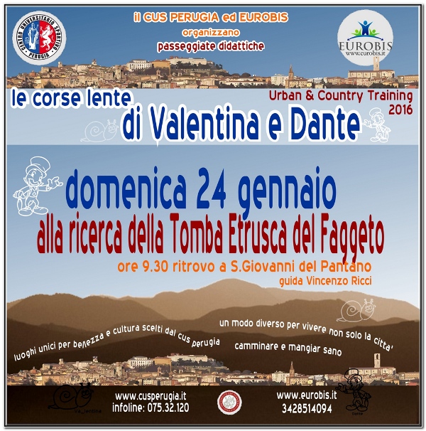 Con l’entrata del nuovo anno il Cus Perugia ripristina l’apprezzatissimo programma delle escursioni culturali che tanto successo hanno riscosso per gli amanti delle camminate all’aria aperta.Ecco dunque che vengono nuovamente presentate ‘Le Corse Lente di Valentina e Dante’, passeggiate didattiche di urban e country training che beneficeranno della presenza di guide escursionistiche qualificate per accompagnare bambini e genitori in visite adatte, per l’impegno richiesto, a tutte le età.