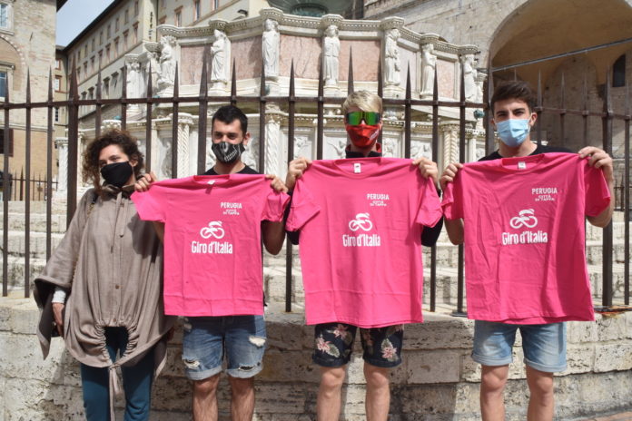 I tre campioni che ieri hanno percorso anche in bicicletta la città di Perugia sono stati omaggiati della maglia ufficiale del Giro d’Italia, in arrivo in città il prossimo 19 maggio, e dello stemma della città di Perugia dall’Assessore Clara Pastorelli.