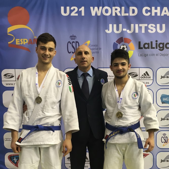 Grinta e determinazione, unite ad un ottimo bagaglio tecnico, hanno permesso ad Andrea Calzoni e Alessio Scricciolo di vincere l’argento ai recenti Mondiali di Ju Jitsu U21, organizzati a Madrid presso il “Polideportivo Municipal Josè Caballero”. Questo importantissimo piazzamento è giunto al termine della gara a squadre, nella specialità Fighting System. I due Nazionali, in forza al G.S. Ju Jitsu Perugia, hanno dato il loro prezioso contributo al Team Italia: Calzoni (categoria 62 kg), in veste di Capitano, ha trascinato i compagni nel match –durissimo- contro la blasonata Russia, dominando il proprio avversario, mentre Scricciolo (categoria 77 kg) ha siglato il punto decisivo in semifinale, avversaria la Romania, demolendo il suo antagonista con uno spettacolare “Full Ippon” (vittoria per manifesta superiorità tecnica). In finale, la Germania si è aggiudicata l’oro, impedendo al nostro tricolore di sventolare ancora più in alto, ma gli Azzurrini hanno dimostrato che la scuola italiana è tra le migliori al mondo. Grande soddisfazione per altri due membri del G.S. Ju-Jitsu Perugia, facenti parte della delegazione ai Mondiali: il M° Paolo Palma, in veste di coach Fighting System e l’ Istr. Raffaele Calzoni (Staff Organizzativo). Il Presidente della gloriosa società umbra, M° Massimo Bistocchi, ha elogiato e ringraziato i suoi ragazzi per questo ennesimo magnifico risultato, spronandoli a dare sempre il massimo in ogni competizione; a questo proposito, tra poco inizieranno le selezioni per la Coppa Europa, in programma a Gent (Belgio) il prossimo 4/5 giugno, importantissima manifestazione riservata alle Nazionali Senior, Andrea e Alessio faranno di tutto per fare parte del Team Italia e recitare un ruolo da protagonisti.
