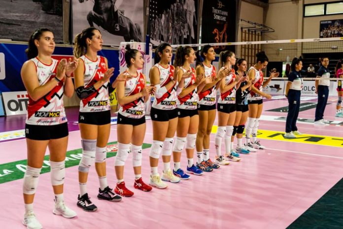 Il primo sestetto stagionale vede Turco in cabina di regia con Perović opposta, Rachkovska e Bolzonetti in posto quattro, Babatunde e Parinial centro con Caforio libero. Dall’altra parte coach Marangi risponde con Manig al palleggio, Giudici Opposto, Dalla Rosa e Patasce in banda, Pero e Negri al centro e Rota libero.