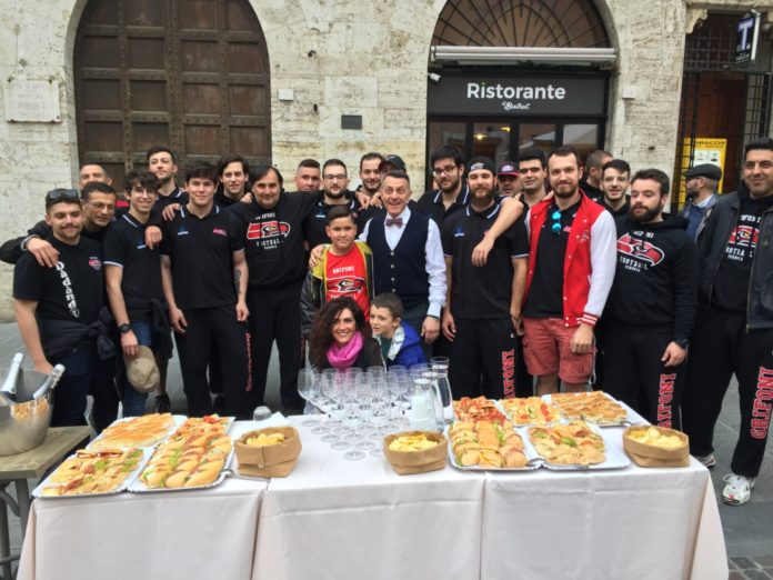Football Americano: i Grifoni Perugia in città per brindare ai play-off. Aperitivo benaugurante offerto dallo sponsor Bistrot in Piazza Matteotti alla presenza di dirigenti, tecnici, atleti della prima squadra e del consigliere delegato allo sport del Comune di Perugia, Clara Pastorelli