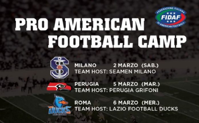 ‘Pro American Football Camp’ questo il nome dell’iniziativa italiana nata dalla stretta collaborazione tra la FIDAF e la Olive Baptist Church, con il prezioso supporto dei Campioni d’Italia in carica, i Seamen Milano, dei Ducks Lazio e dei già citati Grifoni Perugia.