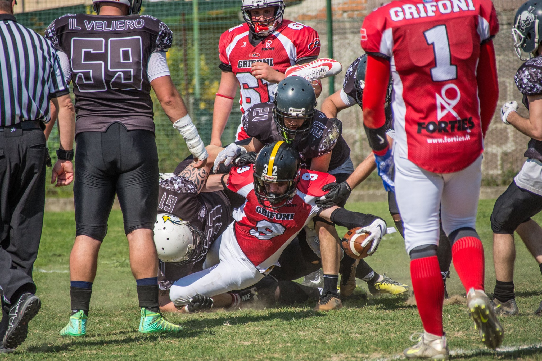I Grifoni Perugia passano Pisa e proseguono la loro avventura nei playoff di terza divisone nazionale. La formazione perugina di Football Americano ha fatto sua la ‘wild card’ sconfiggendo per 29 a 26 i West Coast Raiders Toscana. Una partita intensa e incerta, a cui ha fatto da cornice la prima giornata di vero caldo stagionale. La squadra di casa è partita forte, con i Grifoni che hanno accusato nell’approccio i quasi venti giorni di sosta. Il primo quarto è un monologo toscano, Palombo, Fedeli e Magnanini fissano il risultato sul 9-0. Stessa musica anche ad inizio del secondo quarto. Poi arriva la reazione dei Grifoni: la difesa diventa meno penetrabile e l’attacco si mostra molto più incisivo. Il running back Bartoccioni suona la carica, il quarterback Freddini e il ricevitore Ferrini lo seguono.  Nell’ultimo quarto sono ancora i padroni di casa a prendere il largo con Palombo e Giannoni, portando il divario a nove lunghezze, ma i Grifoni reagiscono nuovamente con un touchdown di Bietta e un extra point di Nimskov. Le difese ora hanno la meglio, il caldo continua a farla da padrone rendendo incerto l’esito della sfida.  I West Coast Raiders si riportano avanti, ma Bartoccioni e Ferrini sono implacabili in attacco e mettono i Grifoni sul 29-26. Risultato che la difesa riesce a conservare fino alla fine e che permette il passaggio del turno.