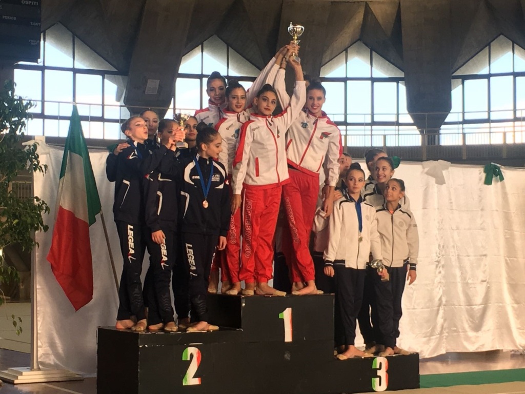La squadra perugina era composta da Jenny Bianconi (corpo libero), Vittoria Laliscia (fune), Francesca Civicchioni (cerchio e nastro), Rebecca Vinti (palla) e Tabatha Barberini (clavette). Tanti applausi, nel palasport pisano “Carlesi”, affollato di appassionati, per le ragazze della società di Pian di Massiano.