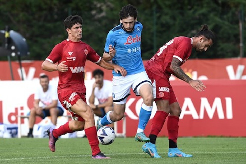 Come prevedibile il Perugia esce sconfitto dall’amichevole di lusso contro il Napoli. A Dimaro la squadra di Castori ha subito un netto 4-1, ma non ha poi così sfigurato rispetto un avversario di categoria superiore e molto quotato. Per l’occasione il tecnico biancorosso ha schierato una formazione rimaneggiata tra indisponibilità e nell’attesa che il mercato faccia il suo corso. 3-5-2 il modulo base con Gori tra i pali, Curado, Sgarbi e Vulikic in difesa. In mezzo Onishchenko, Iannoni e Kouan, Casasola e Angori ai lati, mentre in avanti con Melchiorri il francese Dembelè (in prova). Nel primo tempo il Napoli ha chiuso in vantaggio 2-0 con le reti di Kvaratskhelia e Anguissa. Nella ripresa, Melchiorri ha provato a riaprire l’incontro, ma Politano e Petagna (rigore) hanno fissato il risultato sul 4-1.