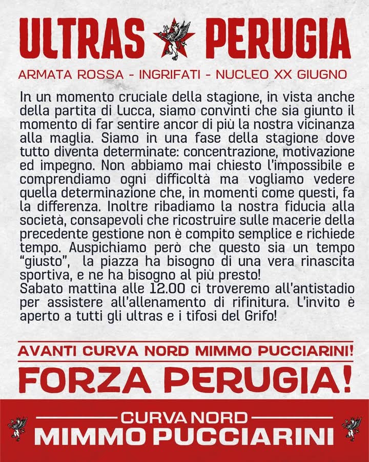 I tifosi del Grifo si sono schierati al fianco di squadra e, soprattutto, della società. Con un comunicato apparso poche ore fa, gli Ultras biancorossi (appartenenti ai gruppi Ingrifati, Armata Rossa e Nucleo XX Giugno) hanno mostrato ancora una volta vicinanza a calciatori e dirigenti, ma a una – più che lecita – condizione: che vengano messe in mostra grinta e determinazione. Tre le parole chiave del comunicato: concentrazione, motivazione e impegno. Ribadita, come già detto, anche la fiducia alla nuova proprietà ma, anche in questo caso, con un ‘paletto’. “Siamo consapevoli che ricostruire sulle macerie della precedente gestione non è compito semplice e richiede tempo Auspichiamo però che questo sia un tempo ‘giusto’ “. Queste le parole del comunicato. Infine, la Curva Nord Mimmo Pucciarini invita tutti i tifosi ad assistere insieme all’allenamento di rifinitura previsto per sabato mattina alle ore 12.