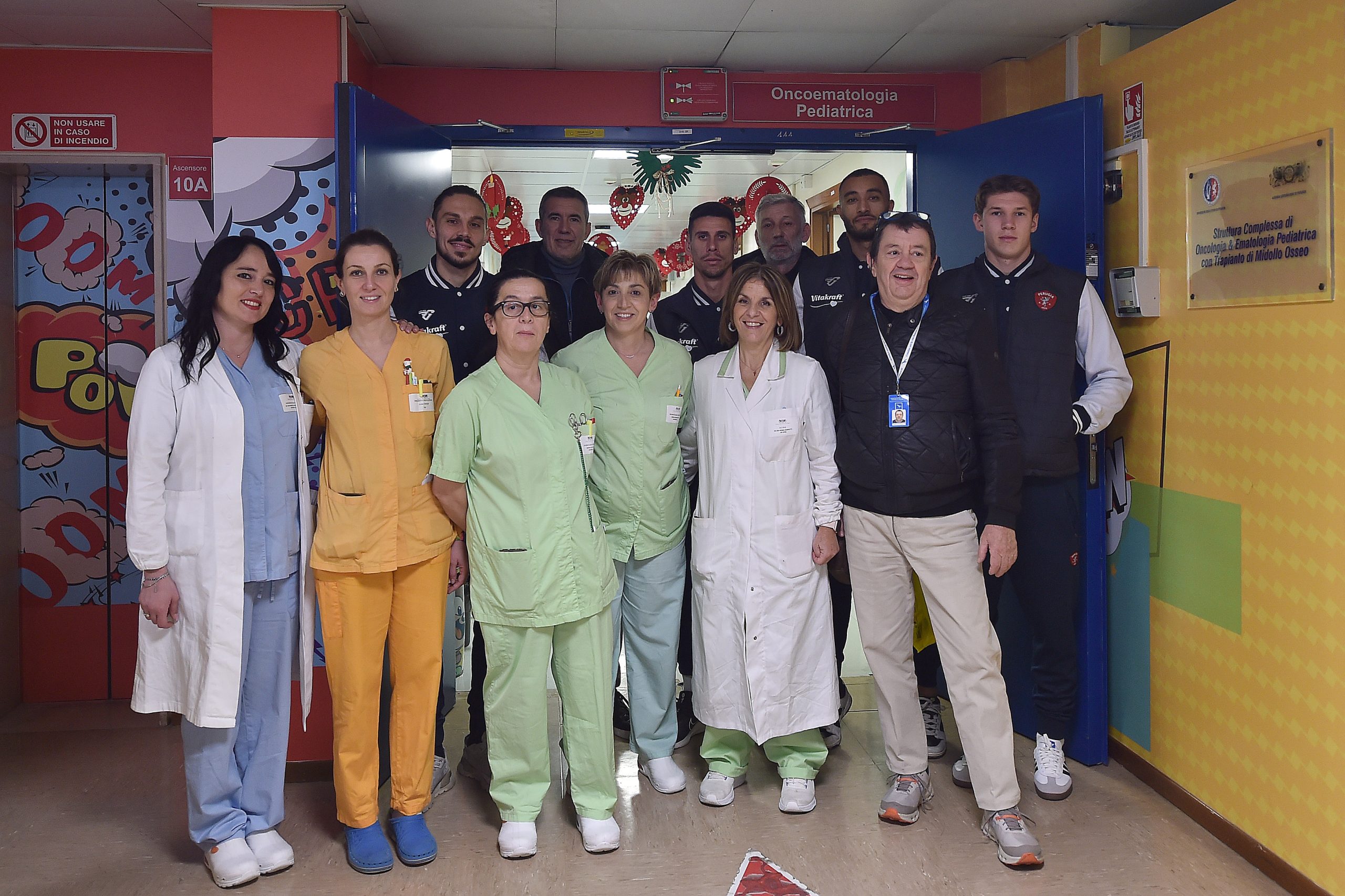 Una delegazione composta dal direttore generale Hernan Garcia Borras, dai giocatori Paolo Bartolomei, Cristian Dell’Orco, Francesco Mezzoni e Adrian Lickunas, accompagnati dal team manager Massimiliano Rossi e dall’ufficio stampa, ha regalato un pomeriggio di gioia ai piccoli malati donando loro alcuni gadget biancorossi come sciarpe, cappellini e altro materiale.