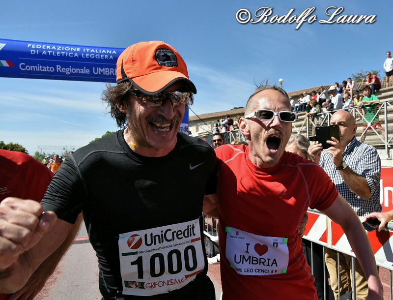 Leonardo Cenci ha battuto il suo record personale alla Grifonissima, da quando la corre con il cancro. La scorsa edizione della gara aveva impiegato 1h 4’18” per percorrere gli 11,886 km previsti; oggi (domenica 14 maggio) l’ha conclusa in 59’03”. Il tutto grazie al supporto tecnico del suo compagno di corsa: il questore di Perugia, Francesco Messina.