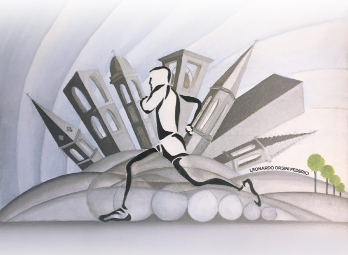 “E’ un quadro dipinto con lo sfondo dei principali punti di vista guardando da sud Perugia. Quello che si nota di più sono questi campanili e monumenti che svettano sulla città. L’opera vuole trasferire un senso di leggerezza, attraverso l’utilizzo di colori un po’ sbiaditi, da trasferire al runner, che con la sua velocità distorce lo sfondo e le immagini, come se vedesse la città passare intorno a sé. C’è anche un tocco di verde, in omaggio alla natura che circonda Perugia e ai suoi bellissimi giardini. L’opera è un omaggio alla Grifonissima e in generale a tutti i podisti che si dilettano quotidianamente in questo sport”.