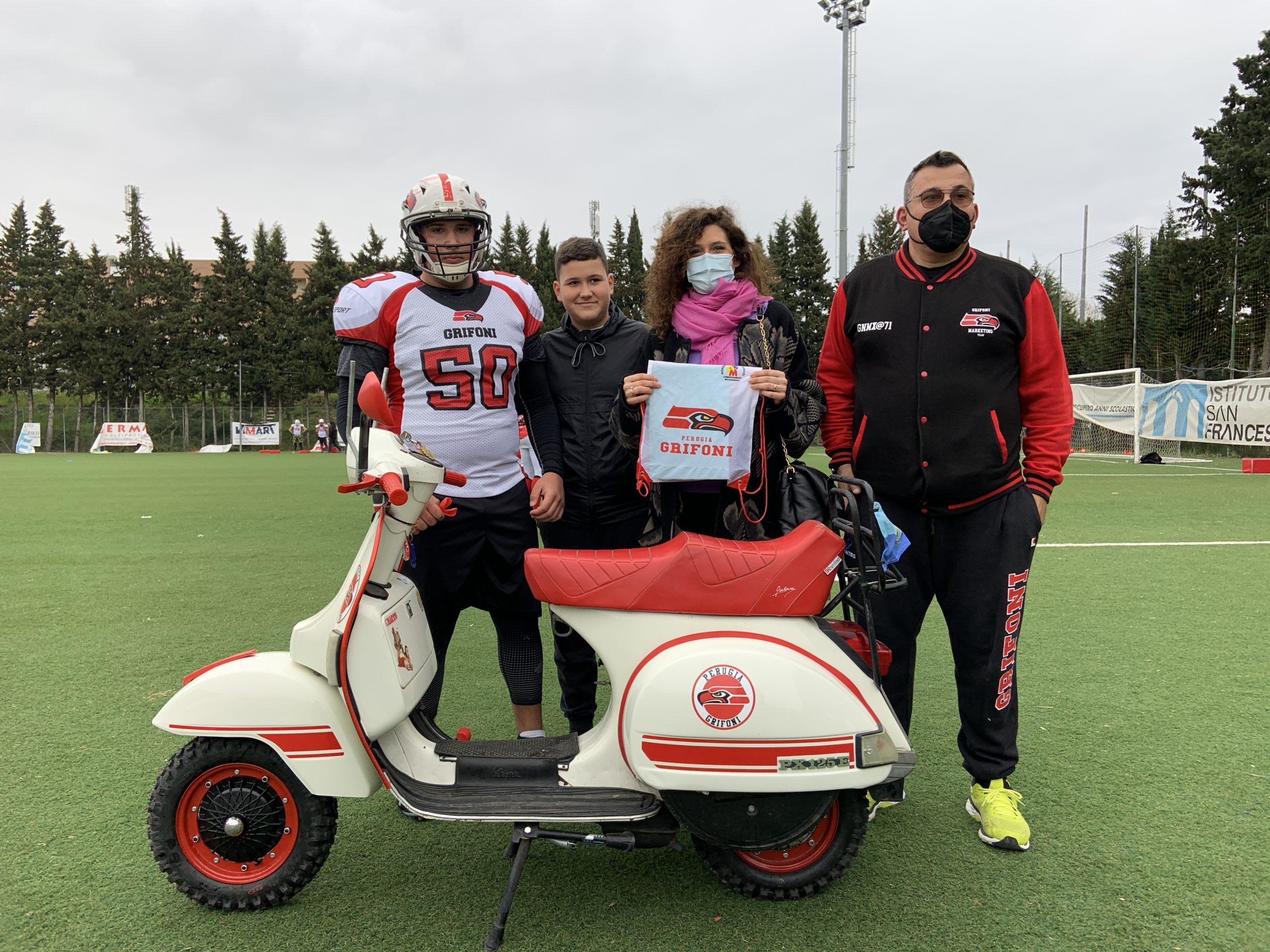 Il Presidente Palomba ha omaggiato l’Assessore Pastorelli con una t-shirt personalizzata dei Grifoni. La Pastorelli si è intrattenuta anche con l’atleta Ambra Marcucci e si è poi regalata uno scatto sopra la bellissima Vespa PX 125 ‘griffata’ Grifoni Perugia dal dirigente Gino Rossini e per l’occasione esposta in campo.