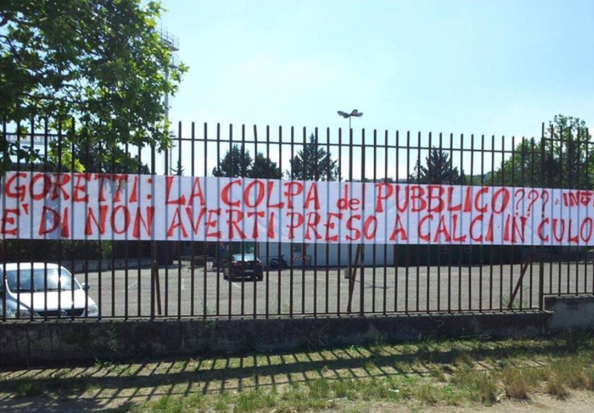 La conferenza stampa di Roberto Goretti non è andata giù ai tifosi del Perugia, soprattutto la parte dove il Ds ha inserito anche il pubblico perugino tra i “responsabili” della sconfitta casalinga contro il Pescara. Una frase “infelice”, che ha scatenato l’immediata reazione sui social network e il giorno dopo ha visto il gruppo degli Ingrifati esprimere il proprio dissenso attraverso uno striscione (“Goretti: la colpa del pubblico? Di non averti preso a calci in c…”), appeso lungo il cancello del piazzale antistante lo stadio “Renato Curi”.