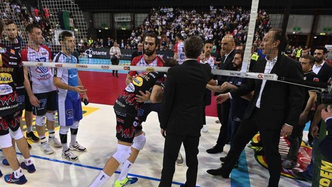 “La Sir Safety Conad Perugia vuole intervenire con la presente in merito ai fatti avvenuti ieri sera al termine di gara 3 dei quarti di finale playoff contro il Vero Volley Monza. E vuole farlo stigmatizzando certamente quando accaduto, figlio anche dell’importanza della posta in palio, della tensione della gara e dell’adrenalina post partita. Al tempo stesso la società ritiene giusto e doveroso evidenziare come il comportamento di un atleta tesserato della società del Vero Volley Monza dopo il fischio finale del match sia stato la causa scatenante della tensione successiva e sia stato dannoso e pericoloso per la pallavolo e per il suo connotato di sportività. E vuole anche sottolineare come i susseguenti momenti di nervosismo siano poi stati riportati alla normalità sia in campo che sugli spalti grazie anche al comportamento corretto e civile dello staff societario e del pubblico presente. Con ciò la società è certa di aver chiarito la vicenda ed intende riportare i toni al livello consono di uno spettacolo sportivo bello come la pallavolo e come il pubblico e la gente che la rappresenta”.