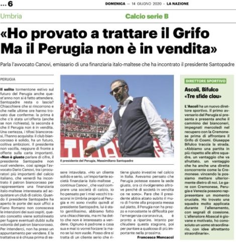 Nell’articolo a firma di Francesca Mencacci, l’Avv. Dario Canovi ha dichiarato di aver bussato pochi giorni fa alle porte degli uffici di Fiano Romano del presidente del Perugia Calcio Massimiliano Santopadre.