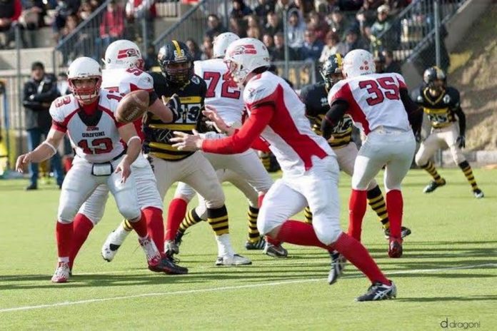 Si sbuffa, si ringhia, si lotta durante l’allenamento dei Grifoni Perugia, proiettati al match post pasquale contro i Minatori Cave in programma a San Sisto domenica 3 aprile. Il team di coach Stefano Caligiana, una vittoria ed una sconfitta nelle prime due gare del campionato di football americano a nove, sta già proiettando l’attenzione alla sfida interna che vedrà opposti i biancorossi al team laziale. Esame da non fallire sulla rotta che porta ai playoff e che sarà seguito, sette giorni dopo, dalla trasferta pescarese in casa dei Crabs battuti all’esordio stagionale. A trainare il gruppo perugino, con la sua esperienza, la sua innata passione e la sua straordinaria capacità di fare squadra, è il quarterback Francesco Freddini: “Negli occhi dei ragazzi si vede una grande determinazione, peccato per qualche infortunio di troppo che in questa parte iniziale di campionato ci ha penalizzato, adesso dobbiamo recuperare le forze e pensare alle due partite contro Cave e Pescara, la nostra stagione per forza di cose passa da queste sfide molto importanti per centrare l’obiettivo dei playoff”. Attorno alla compagine perugina, che vanta una grandissima tradizione in questa disciplina, si sta consolidando anche un buon numero di tifosi. Come a dire, l’attenzione cresce nei confronti dei Grifoni che vogliono assolutamente salire di intensità, in campo come fuori. “Senza dubbio – continua il numero 13 biancorosso -, da quest’anno abbiamo la possibilità di giocare in un impianto come quello di San Sisto che è ideale per la pratica del nostro sport ed i dirigenti stanno facendo tanti sforzi per coinvolgere gli appassionati. Soprattutto per loro vogliamo fare bene”. Una lunghissima carriera nel football americano, Francesco Freddini partì dal mitico Santa Giuliana, da un famoso reclutamento di fine anni ’80 al quale risposero tantissimi atleti… “Fu l’indimenticato presidente Giuseppe Belia a convincermi. Guardavo le partite in tv, da sempre tifoso dei San Francisco 49ers della mitica triade Montana-Craig-Rice. Vedendo su quel campo tanta gente vogliosa di rappresentare Perugia, i pali a Y originali, l’entusiasmo straripante di ogni partecipante mi galvanizzai immediatamente”. Ne è passato di tempo, ma la passione resta intatta, genuina, trascinante… Freddini ha girato tutto il centro Italia, vestendo le casacche di Roma, Ancona, Firenze, Ferrara, Bologna e adesso sa bene che anche dal suo carisma passano le fortune dei Grifoni: “Ce la metteremo tutta, partita dopo partita, tenendo sempre presenti i valori di questo bellissimo sport ed al tempo stesso cercando di portare in alto il nome di Perugia”.