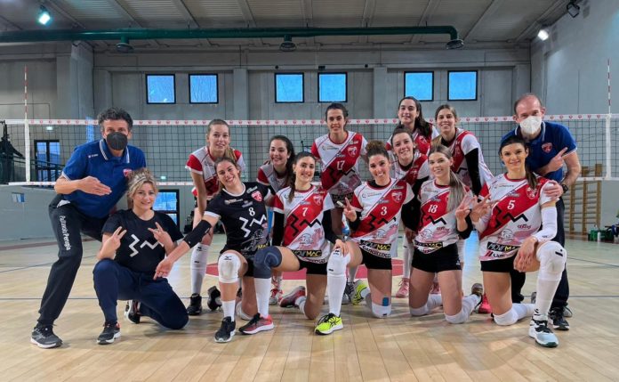 Sedici vittorie su diciotto partite. Continua a marciare in vetta alla classifica la 3M Perugia, che nell’ultimo turno della regular season del campionato di B1 girone E (in attesa dei recuperi di aprile) ha liquidato con un netto 3-0 la Energia 4.0 De Mitri. Un successo quello ottenuto al Capitini (sabato 26 marzo) che bissa l’altro 3-0 maturato a metà settimana sempre contro la formazione marchigiana, nella sfida di recupero dell’undicesima giornata non disputata a gennaio causa Covid. Pero e compagne in soli tre giorni hanno messo insieme sei punti che le proiettano a quota 46 in classifica a più 8 da Castelfranco, vincitore nel doppio confronto settimanale contro Trevi. Ora sulla strada per raggiungere il primato definitivo, che vale la finale playoff contro la prima del girone F, restano le quattro gare di recupero a partire da quella di sabato prossimo a Chieti. Per la matematica certezza del primo  posto, salvo inciampi in Abruzzo, servirà attendere la successiva sfida casalinga (9 aprile) contro Pomezia.
