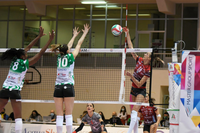 La Bartoccini-Fortinfissi Perugia parte bene vincendo il primo set in recupero, ma poi termina la rincorsa e cede 3-1 ( 22-25, 25-22, 25-22, 25-21 i parziali), contro la Megabox Ondulati del Savio Vallefoglia, in una gara caratterizzata da un’alta fallosità dai nove metri manifestatasi da entrambe le parti con 19 errori per le umbre e 12 per le marchigiane, con un impatto pesantissimo sul computo totale del match, che a livello numerico termina 97 a 90 per le padrone di casa.