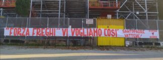 A margine della scritta non è però mancato quel ‘Santopadre vattene’ divenuto marchio di tutti gli striscioni che dalla retrocessione in poi la Nord ha affisso presso l’impianto sportivo cittadino.