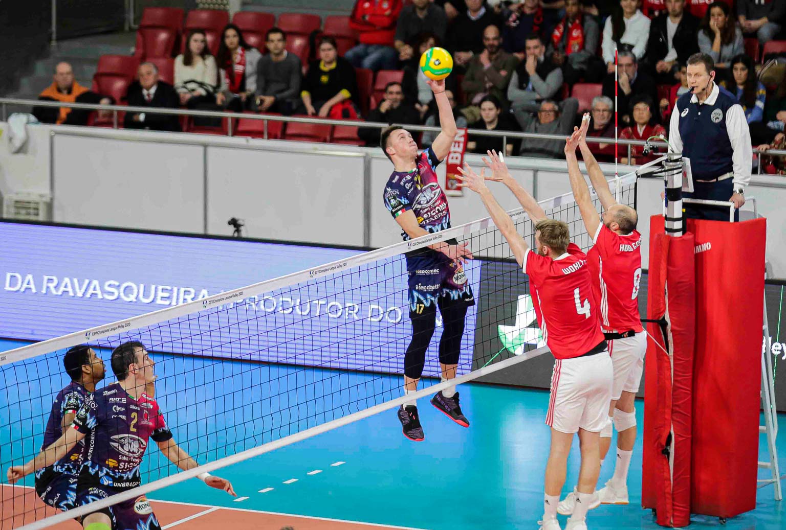 I Block Devils, già sicuri del primo posto e quindi della qualificazione ai quarti di finale prima di scendere in campo, espugnano il palasport del Benfica Lisbona in quattro set, volano a 15 punti dopo cinque gare e sono, con una giornata d’anticipo, una delle migliori quattro che saranno quindi teste di serie nel sorteggio della fase ad eliminazione diretta.