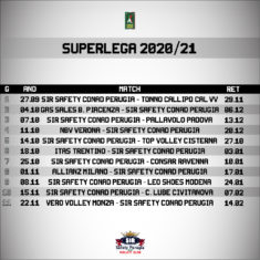 Tra le date da cerchiare in rosso al PalaBarton l’8 ed il 15 novembre con la Sir che ospita prima Modena e poi Civitanova, il 6 dicembre giorno della gara casalinga contro Piacenza ed il 3 gennaio quando a Pian di Massiano arriverà Trento. L’inizio dei playoff è fissato per il 21 febbraio.