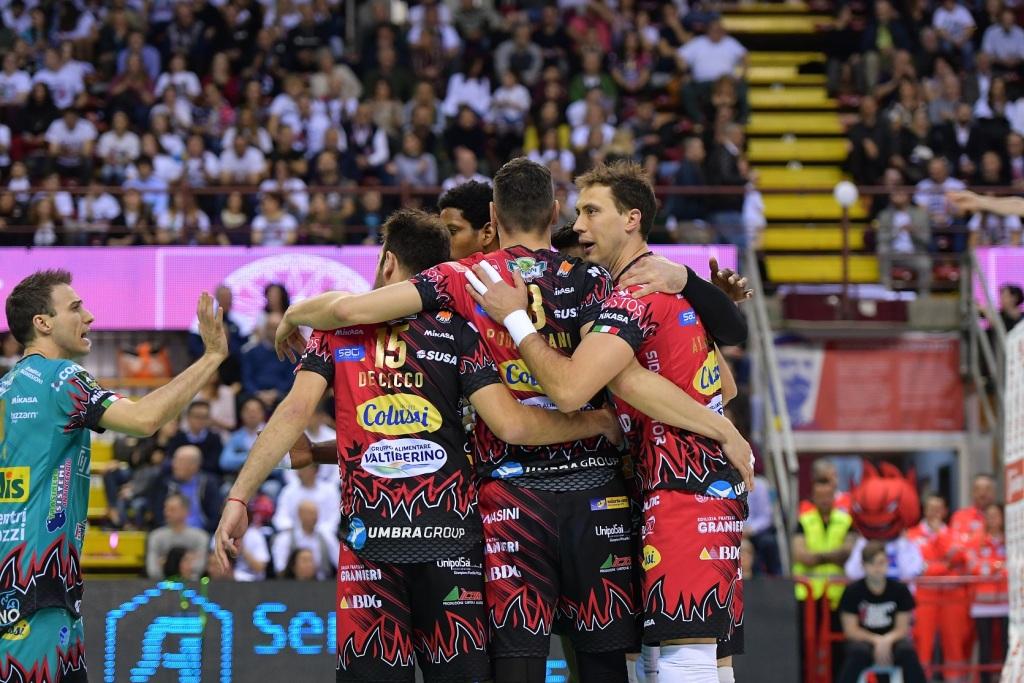 Due set, i primi, di marca Sir con Atanasijevic e Leon a menare le danze e con De Cecco a distribuire con la consueta qualità ed imprevedibilità. Poi nel terzo parziale la reazione patavina che alza il muro e l’efficienza offensiva. Gli ospiti arrivano fino al 13-18 ma non hanno ancora fatto i conti con l’arma micidiale di Perugia: la battuta. Comincia Atanasijevic (un ace), poi nel turno successivo Leon spara tre fiammate sopra i 130 Km/h e completa la rimonta con il palazzetto che diventa una bolgia.