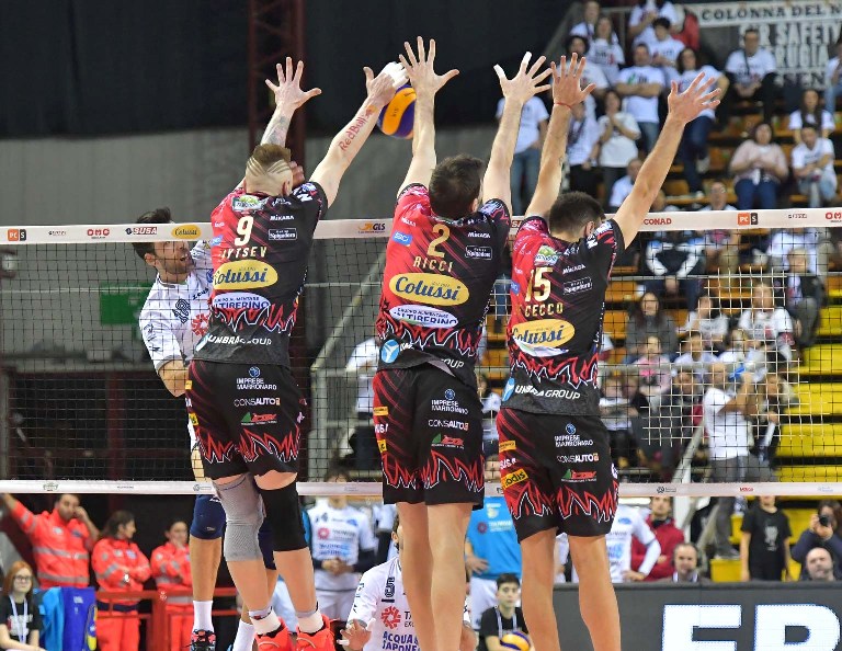Ivan Zaytsev schianta in terra il contrattacco che consegna ai Block Devils i tre punti in palio e soprattutto i tre punti della matematica certezza del primo posto in Superlega. Un traguardo storico e mai raggiunto prima d’ora dalla società del presidente Sirci. La vetta solitaria garantisce il vantaggio del fattore campo in tutti i playoff e la qualificazione ai gironi della prossima Champions.