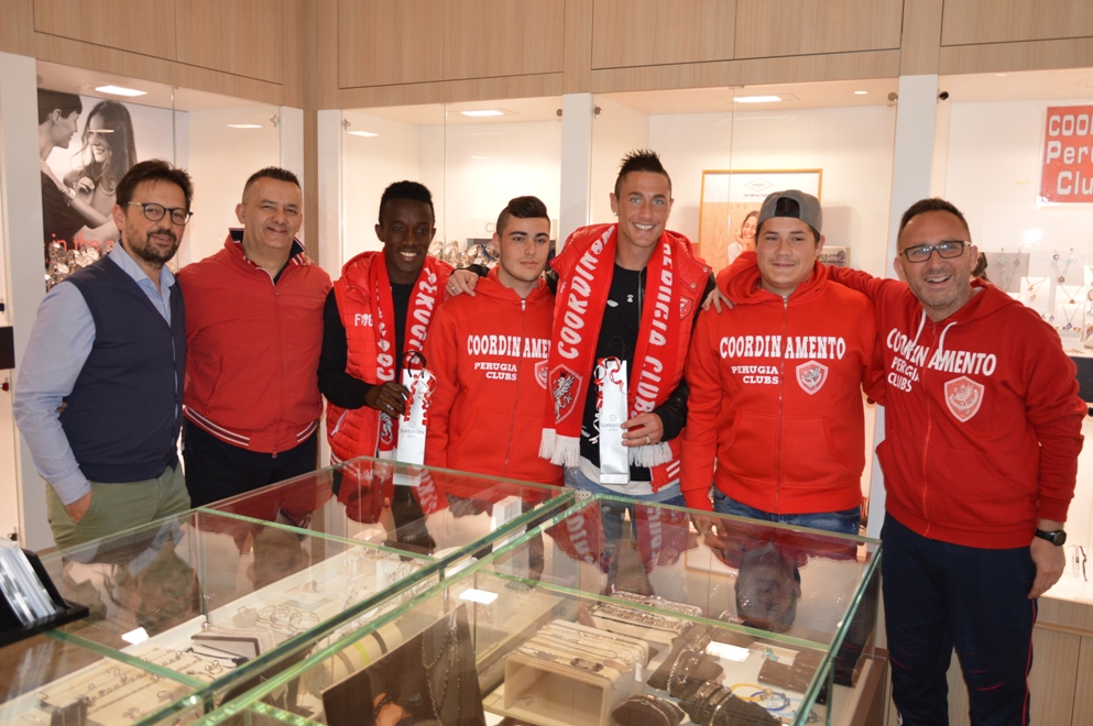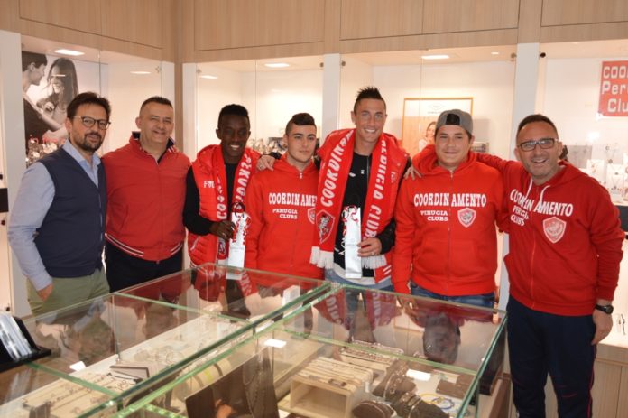 Se sembra ormai chiuso il campionato del Perugia calcio, con sempre più flebili possibilità di approdare ai play off, tutt’altro fa registrare il trofeo ‘Miglior Grifone Gioielleria Bartoccini’. Quando mancano solo quattro partite alla fine del campionato, sono in tanti, infatti, a insidiare la prima posizione, da tempo nelle mani del portiere Rosati. Negli ultimi incontri, a smuovere la ‘classifica’ al vertice del campionato parallelo, organizzato dal Coordinamento Perugia Clubs, sono stati l’attaccante Matteo Ardemagni e il giovane centrocampista Pierre Desiré Zebli premiati dai tifosi biancorossi il primo in Brescia-Perugia 2-2, il secondo in Perugia-Avellino 2-0. Premi, in buoni acquisto da spendere nei punti vendita Bartoccini, che sono stati consegnati mercoledì 27 aprile, nella gioielleria di Pian di Massiano, da Mauro Tramploni e Stefano Mortini, rispettivamente presidente e vicepresidente del Coordinamento Perugia Clubs, Monica Landi, presidente del Perugia club Army girls, e Marco Scocciolini, direttore dello stesso punto vendita Bartoccini.