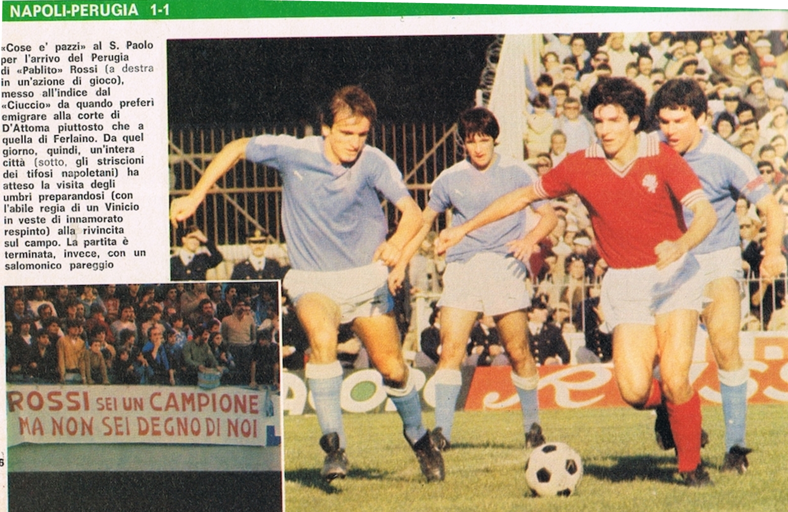 Le cause? La presenza di Paolo Rossi tra le fila umbre, reo di aver rifiutato il Napoli in estate. L’attaccante fu accolto da bordate di fischi, ma sarà proprio lui a segnare su rigore il gol del momentaneo vantaggio.