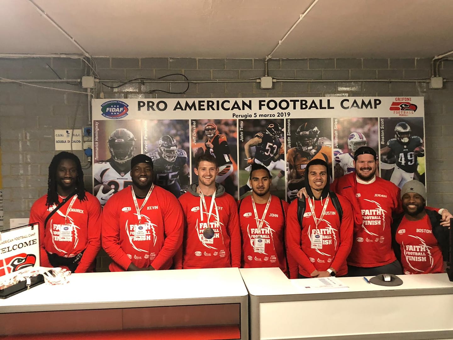 Perugia capitale, per un giorno, del football americano italiano. Martedì 5 marzo al ‘Comunale’ di San Sisto si è tenuta la seconda tappa del Pro American Football Camp, evento promozionale organizzato dalla Fidaf e dalla Olive Baptist Church con la presenza di ben sette atleti della NFL. La comitiva statunitense, capitanata da Scott Crouch, ex atleta con trascorsi importanti anche in Italia, ha dapprima fatto tappa a Milano (2 marzo), mentre il 6 marzo si è poi trasferita a Roma. La giornata perugina, per la quale fondamentale è stato il contributo in termini di organizzazione e accoglienza della società Grifoni Perugia, è iniziata intorno all’ora di pranzo quando le ‘star della NFL’, gli accompagnatori e dirigenti biancorossi si sono ritrovati per un ‘branch’ al ristorante Bisbò all’interno del Barton Park di Pian di Massiano.