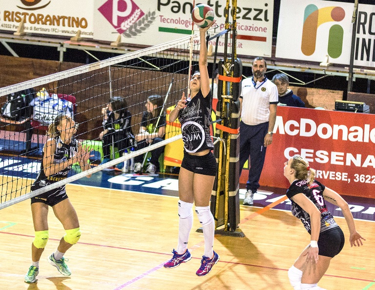 La cronaca. Nulla ha potuto la Volley Club Cesena che è stata piegata in maniera netta per merito di una prestazione convincente e priva di sbavature che ha messo in evidenza la fase-punto con battuta e muro capaci di far sentire il loro peso specifico. Cominciano bene le ospiti con Gorini schierata titolare in regia e brava a servire le compagne che si trovano a contrastare Calisesi ed Altini (11-12). L’allungo di Minati è irresistibile e porta al vantaggio. Invertiti i campi le locali continuano a subire le incursioni di una Catena superlativa (6-13). Il buon ingresso di Leonardi tra le romagnole riesce a contenere il distacco nella fase centrale (14-18). È solo una parentesi perché Cruciani riparte e manda sul due a zero. Il terzo frangente di gioco è il più equilibrato con le padrone di casa che le provano tutte per contrastare la potenza di fuoco di Catena e Minati (8-11). Con una serie di sostituzioni le cesenati provano a cambiare il trend ma ad impedirglielo è Cruciani che fa scorrere i titoli di coda.