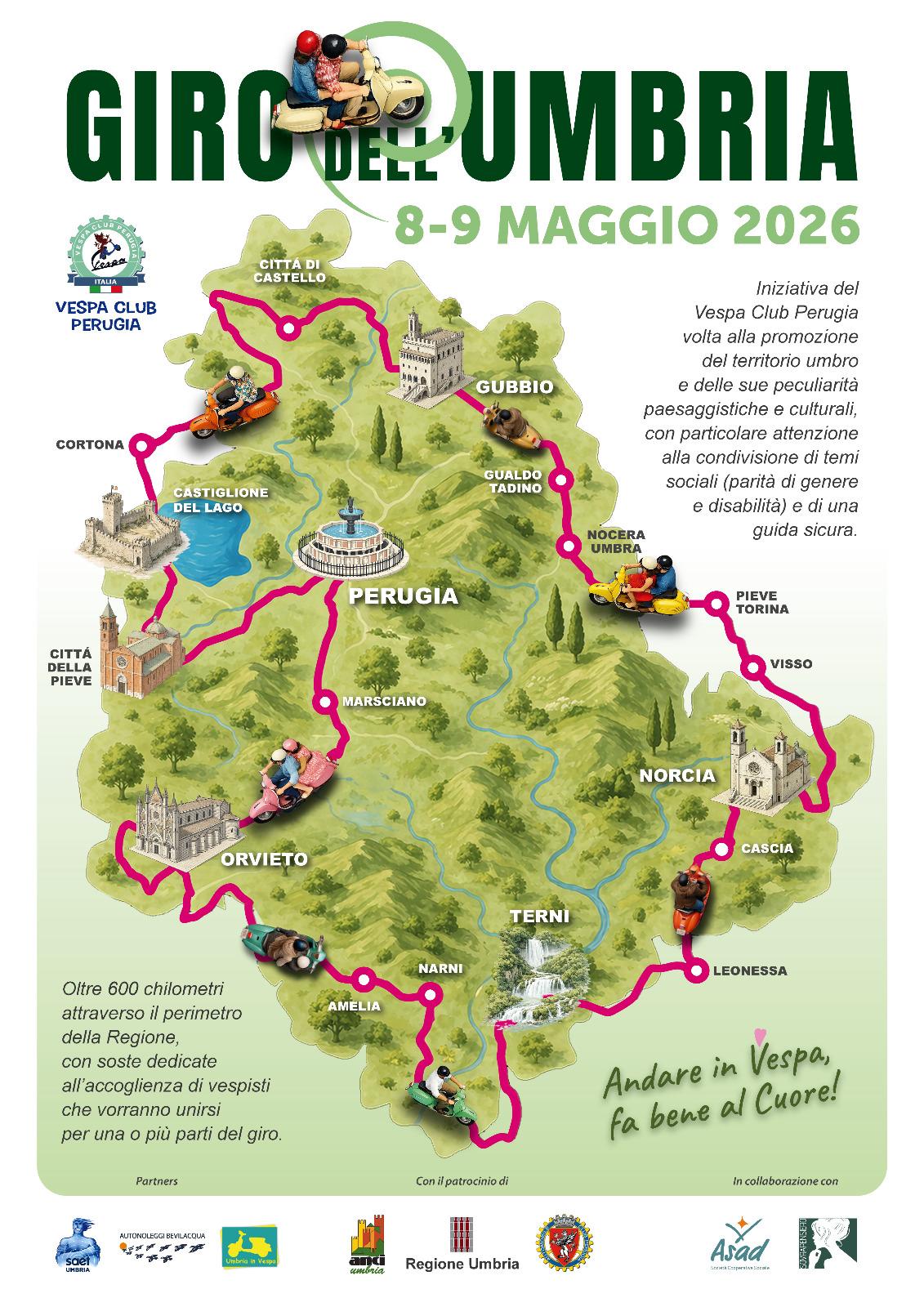 SOSTEGNO ISTITUZIONALE – Il ‘Giro dell’Umbria’ ha trovato la calorosa accoglienza dell’Assessore allo sport e al turismo della Regione Umbria, Simona Meloni, che ha concesso il patrocinio dell’ente. Coinvolta anche Anci Umbria, visto che due tappe del giro saranno dedicate alla scoperta di piccoli comuni: Otricoli e Citerna. Ha confermato la sua vicinanza al Vespa Club Perugia anche Aci Perugia, con l’obiettivo di continuare a diffondere il tema della guida sicura.