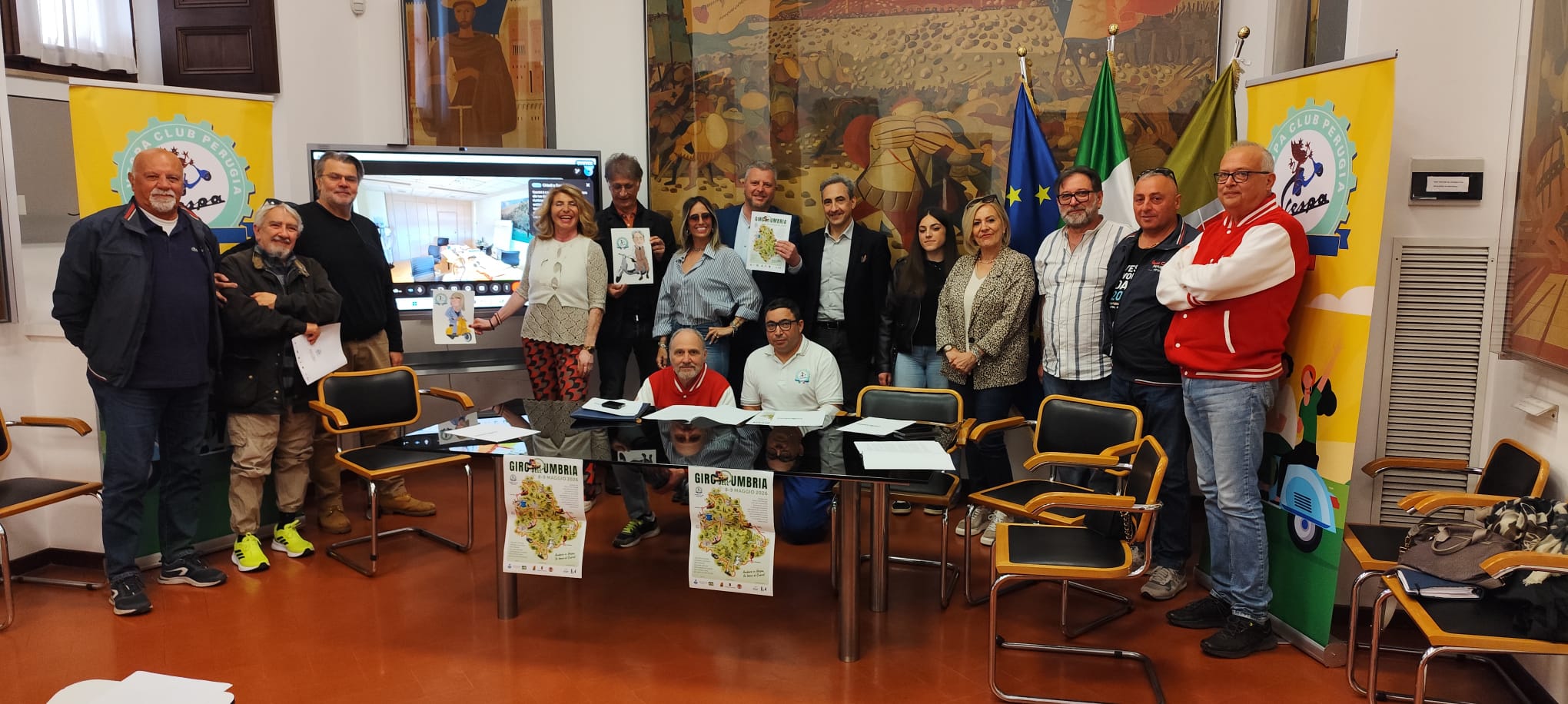 L’evento è stato presentato lunedì 27 aprile presso la Sala Fiume di Palazzo Donini a Perugia, alla presenza (in collegamento) dell’Assessore allo Sport della Regione Umbria, Simona Meloni, del Presidente di Aci Perugia, Ruggero Campi, del Direttore di Anci Umbria, Silvio Ranieri, della Presidente della Cooperativa Asad Liana Cicchi e della Presidente dell’associazione Sovrapensiero Elena Capucella e della Vice Donatella Binaglia. Nutrita anche la rappresentanza di vespisti, capitanata da Andrea Sonaglia (Presidente Vespa Club Perugia) e da Maria Cristina Tortoioli (Vice Presidente Vespa Club Perugia)