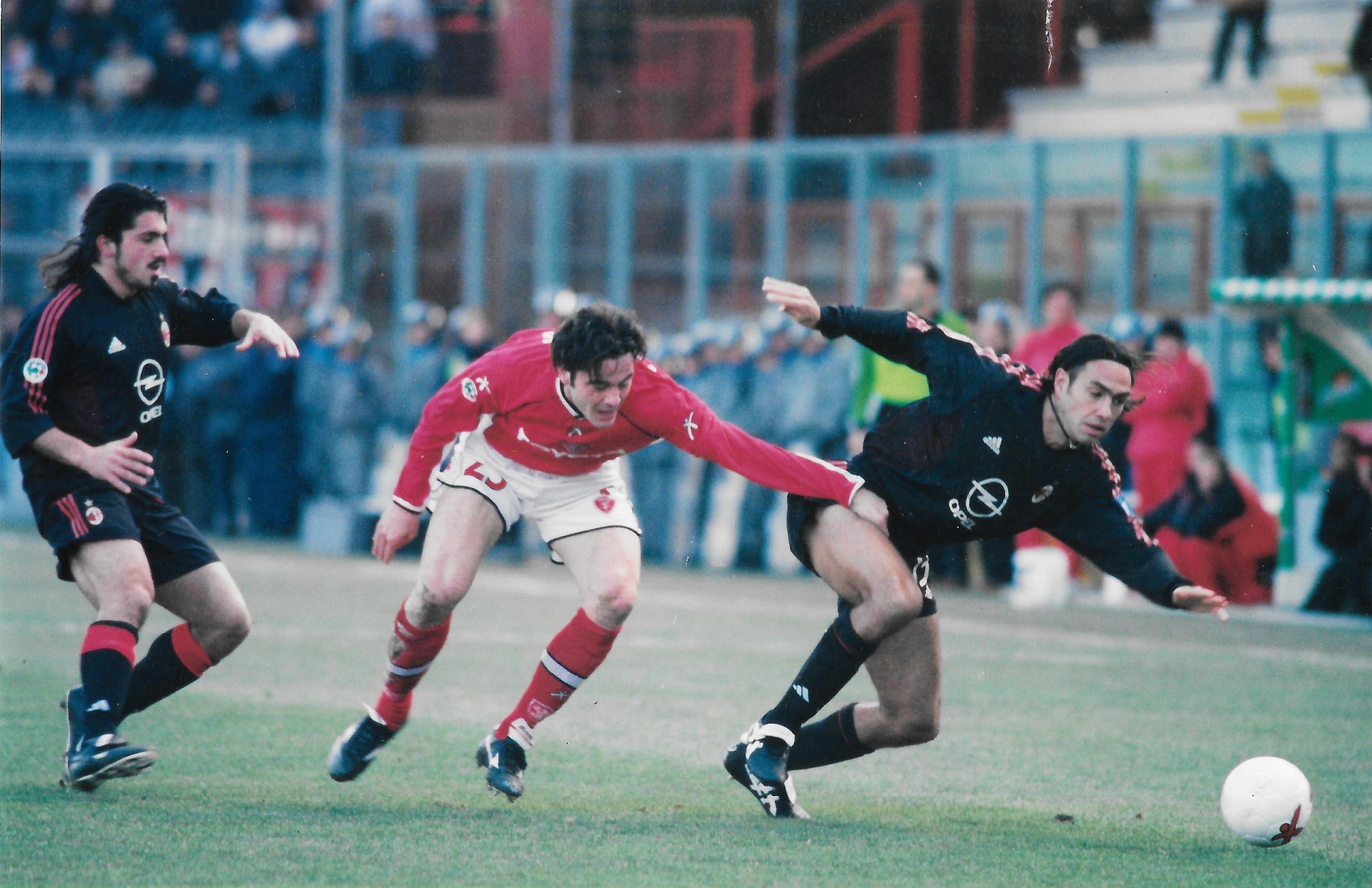 Nella foto l’attuale tecnico dei Grifoni Alessandro Nesta faticava a contenere l’esuberanza dell’attaccante greco Zisis Vryzas, nonostante l’aiuto di un altro giocatore sbocciato a Pian di Massiano. Gennaro Gattuso, attuale guida del Milan.