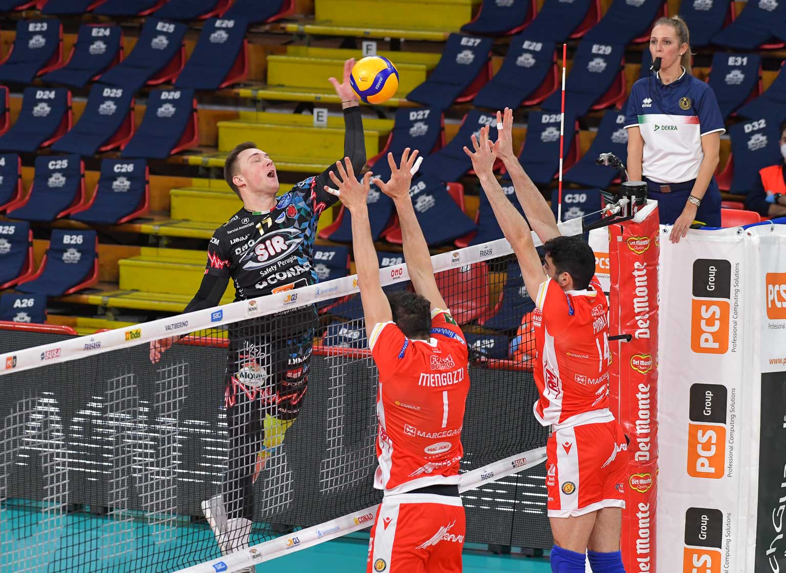 Perugia, con Heynen lancia dal primo punto i rientranti Atanasijevic e Russo, va a strattoni, sbaglia un po’ più del consentito (34 alla fine gli errori gratuiti contro i 16 degli avversari), ma ha il merito di restare sempre attaccata al match facendo leva sul servizio (decisivi alcuni turni di Leon e di Plotnytskyi) e sul muro (13 i vincenti, 4 di Solè).