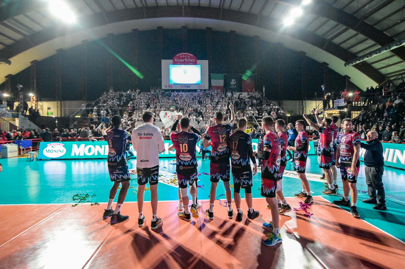 Esulta il PalaBarton all’ace finale (e non poteva essere altrimenti) di Leon con la Sir Sicoma Monini che si prende la posta piena e si porta in testa alla Pool insieme al Varsavia, vincente in tre set contro il Tours.