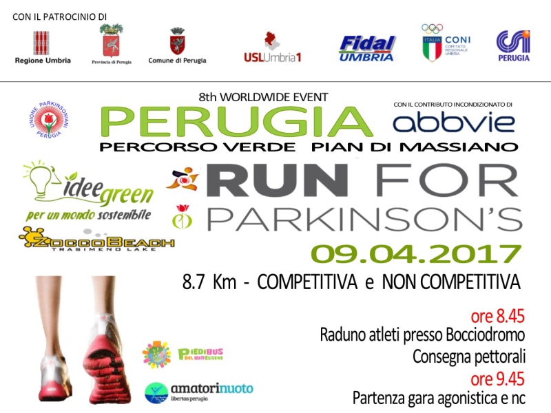 Sport e solidarietà tornano protagonisti al percoso verde di Pian di Massiano, domenica 9 aprile, con “Run for Parkinson’s”. E’ tutto pronto per la manifestazione internazionale che, nel 2016, ha visto la città di Perugia al primo posto per numero di partecipanti, tra le 27 concorrenti italiane. L’evento, organizzato dalla onlus “Unione parkinsoniani Perugia” con il conivolgimento della Fidal, del Coni e il Csi comitato , è patrocinato dalla Asl Umbria 1, dalla Regione Umbria, dal Comune e dalla Provincia di Perugia. Anche per questa edizione è previsto per tutti i partecipanti il ritiro di un “pacco gara”, premi per gli alteti e le società sportive, premi sorteggiati per i partecipanti alla “Family Run”, crocchette e gadget per tutti gli amici a quattro zampe e un punto ristoro per accogliere i concorrenti al termine del percorso. Si tratta di un appuntamento consolidato all’interno della città e ben strutturato. Dodici categorie competitive, tra maschile e femminile, impegnate in un percorso di circa 8,7 km che partirà alle ore 8.45. Alla stessa ora prenderà il via la corsa non competitiva. Nel programma della mattinata sono inserite le iniziative “Nordic walking” e la passeggiata in mountain bike. Dalle 9.30 alle 13 sarà possibile prendere parte alla “Family Run”, una passaggiata di 3 km con partenza libera e, in contemporanea, sarà allestito uno spazio dedicato agli amici animali “Bau for Parkinson’s”.