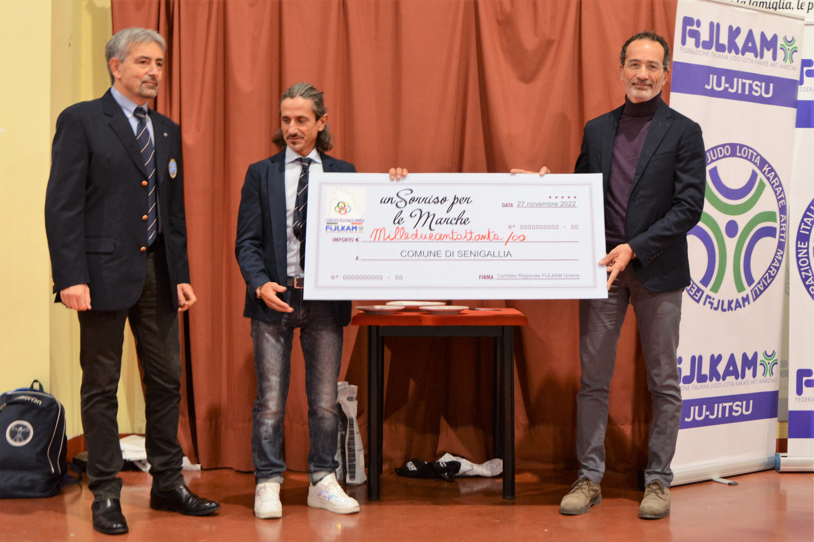 Alla cerimonia di consegna dell’assegno simbolico hanno partecipato il Vicesindaco, Assessore allo Sport del Comune di Senigallia Riccardo Pizzi e Marco Masi presidente del Comitato Regionale Fijlkam.