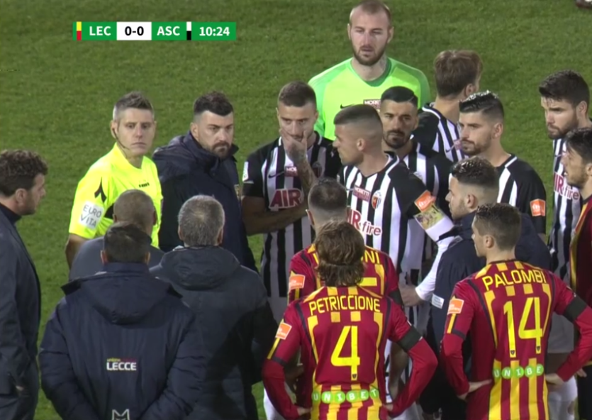 L’arbitro di Lecce-Ascoli ha il buonsenso, coadiuvato via telefono anche dai vertici dell’Aia, di sospendere subito la gara dopo il pauroso, fortuito incidente del primo minuto di gioco, nel quale il giocatore del Lecce, Scavone, aveva perso conoscenza. Una decisione saggia e giusta che fa onore al fischietto toscano, uno dei migliori della categoria, che ha subito condiviso la richiesta arrivata dalle due squadre.