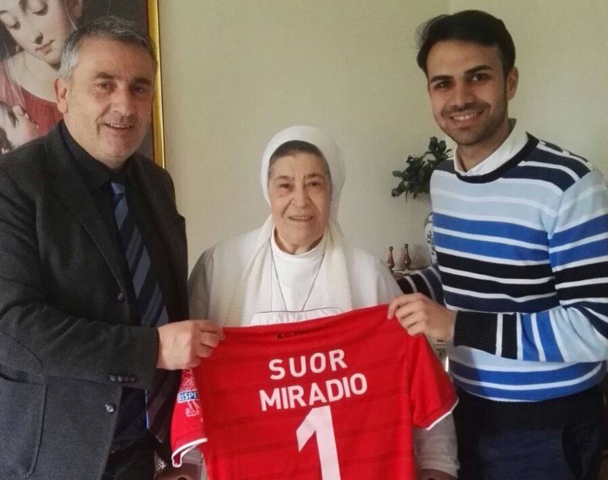 Suor Miradio opera in Umbria da 44 anni nella casa di riposo delle suore del Sacro Cuore all’interno della struttura “Villa Sereni” che comprende anche una scuola dell’infanzia a Perugia. Cosa ha di particolare suor Miradio? Che da quando si è trasferita da Potenza qui in Umbria è diventata tifosissima del Perugia. La madre superiora però non ha mai dato il permesso per assistere dal vivo ad una gara della squadra biancorossa. Così lei quando il Grifo scende in campo prende la sua radiolina e ascolta la partita con grande passione. Passione che però deve rimanere confinata all’interno dell’istituto ma con il vivo desiderio di poter assistere un giorno ad una partita del Perugia e conoscere il presidente Santopadre. Nell’attesa il Responsabile Settore Giovanile Giovanni Guerri e il Responsabile Organizzativo Francesco Gaudenzi hanno donato a suor Miradio una maglia personalizzata così almeno per il momento potrà stare un pò più vicino alla maglia biancorossa.