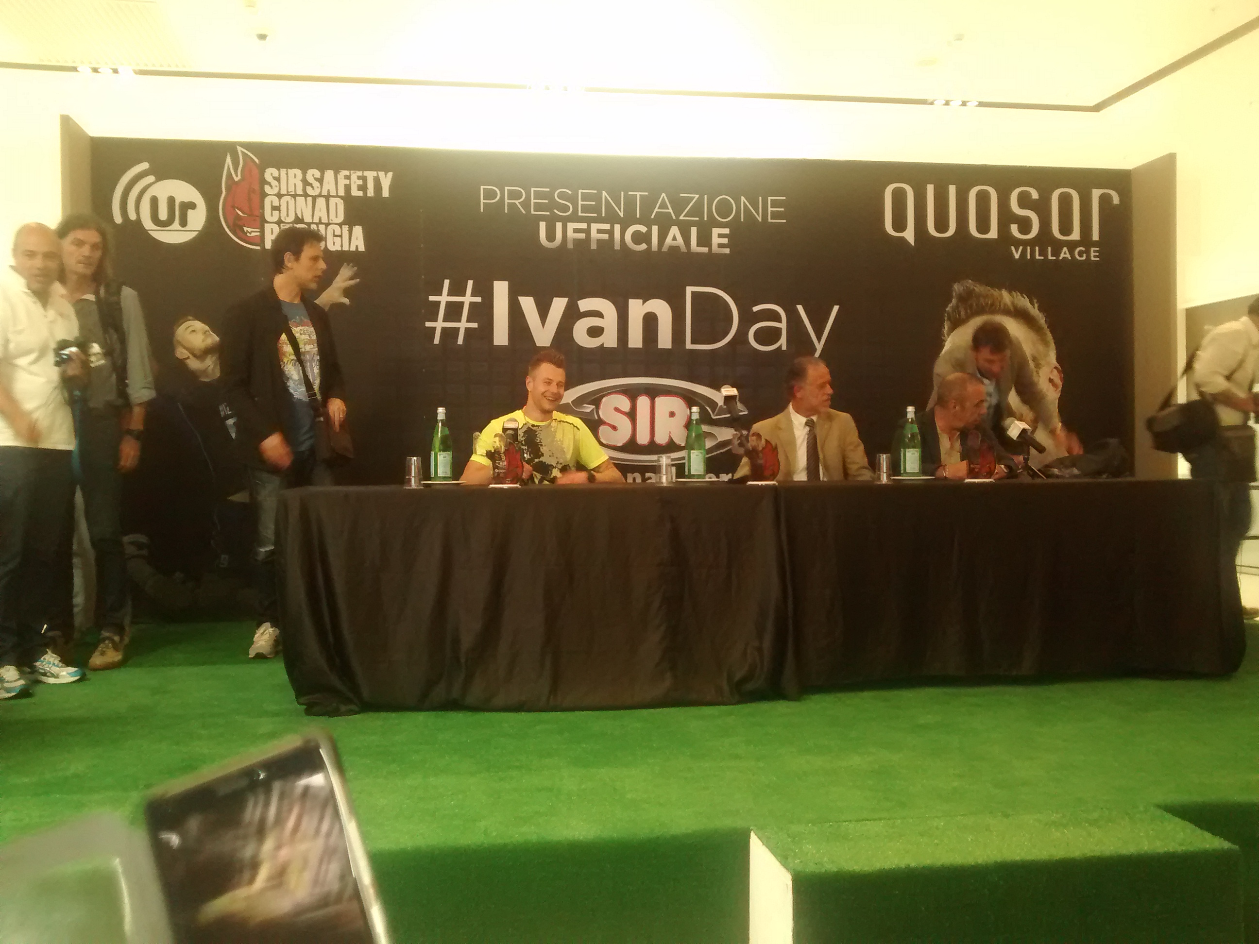 In una giornata che di estivo ha solo la data, la Sir Safety di patron Sirci presenta il suo nuovo gioiello Ivan Zaytsev. Un palmares importante per lo schiacciatore spoletino, svariati ori ed argenti con la maglia azzurra, campione d’Italia con la maglia della Lube Macerata. La scelta del Quasar Village come location della presentazione non è casuale per la massiccia presenza, oltre quattrocento, di tifosi non solo Sir ma anche personali del pallavolista nostrano. Presente anche Danilo Toppetti per conto dello sponsor Conad che così presenta Zaytsev: